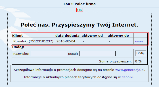 Polecający dodaje w Systemie Zarządzania Kontem nazwiska oraz numery PESEL osób, którym polecił nasze usługi. W przypadku, gdy wskazane osoby zamówią usługę, Polecający otrzymuje bonus w postaci +30% szybkości działania Internetu za każdego nowego abonenta sieci.